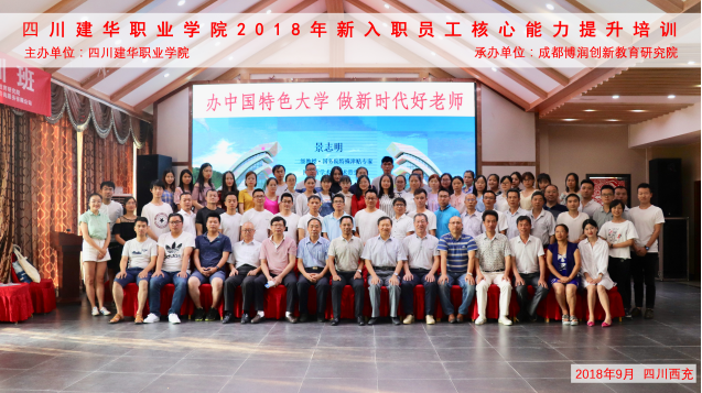 9月1日由四川建华职业学院主办,教育部高校毕业生就业协会核心能力分会四川省管理中心、成都博润教育机构承办的为期六天的2018年新入职员工核心能力提升培训班在田园印象酒店举办,四川建华职业学院领导出席培训并做了重要讲话。