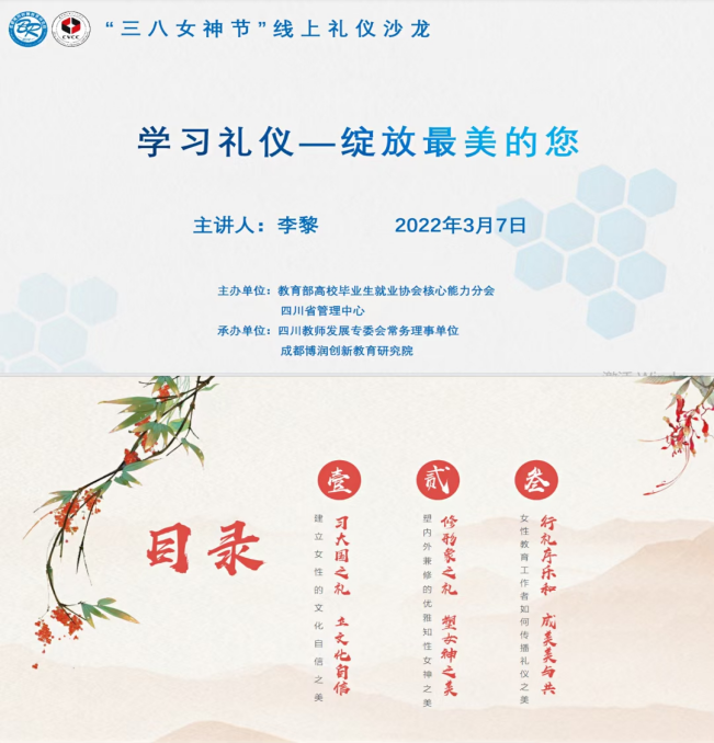 2022年“三八国际劳动妇女节”即将到来之际,教育部高校毕业生就业协会核心能力分会四川省管理中心、成都博润创新教育研究院共同举办的“三八女神节”线上礼仪沙龙,3月7日在博润创新教育云课堂成功举行,参与人数557人。
