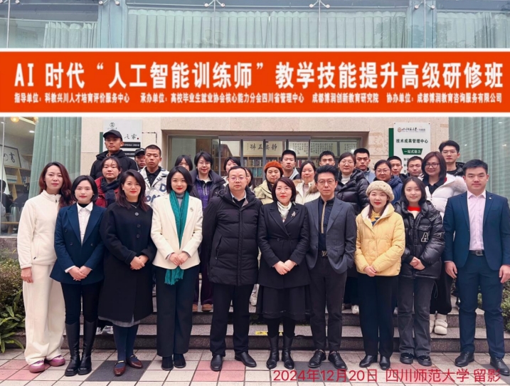 12月20日至22日,由科教兴川人才培育评价服务中心指导,高校毕业生就业协会核心能力分会四川省管理中心、成都博润创新教育研究院承办,成都博润教育咨询服务有限公司协办的首届AI时代“人工智能训练师”教师技能提升高级研修班在四川师范大学完美收官。本次研修班旨在响应国家号召,紧跟时代步伐,提升博润在人工智能教育领域的专业水平,帮助教师掌握这些先进技术,并将其融入日常的教学与研究之中,实现真正的智慧教育升级。